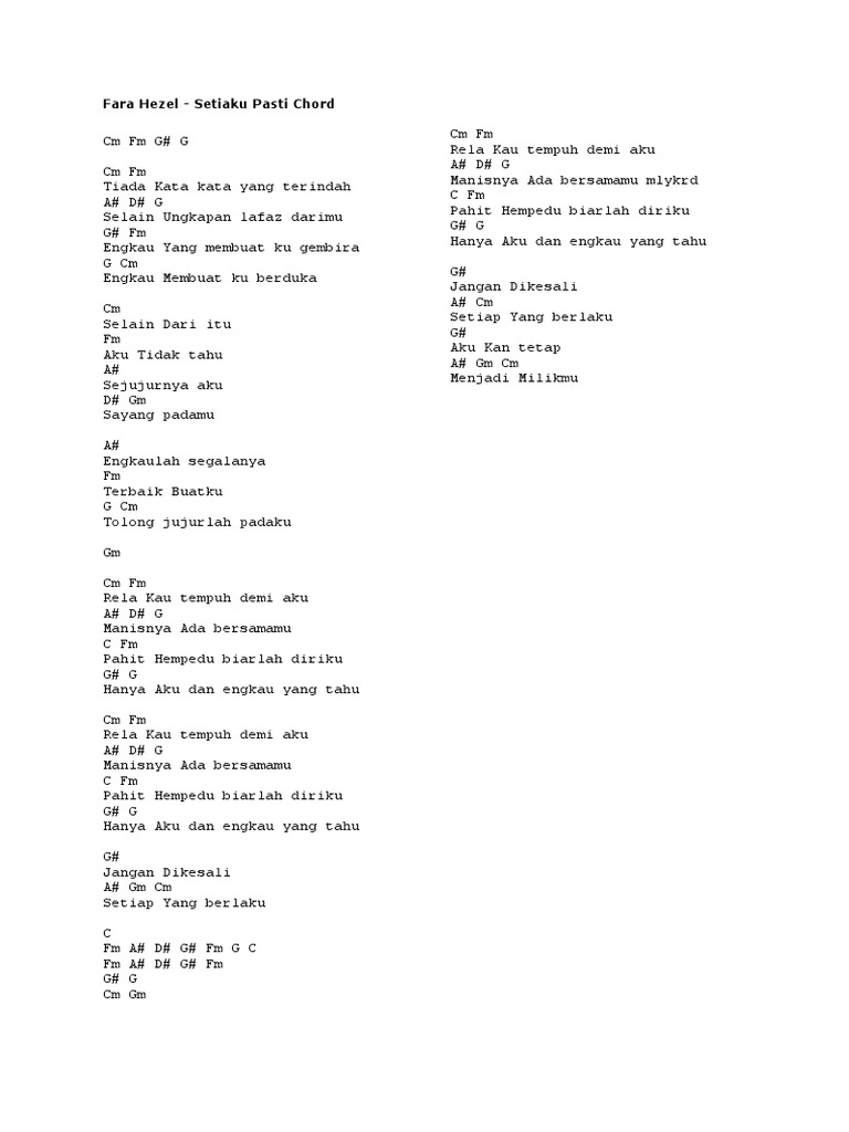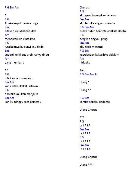 F g em am 2x ulang ulang f g am kerana setiaku padamu ulang chorus f g la la la em am la la la f g la la la em am la la la. F g em am f g adakalanya ku rasa curiga em adakah kau disana tidak am mendustakan cinta kita f g adakalanya ku sunyi kau tiada em am seperti ku hilang arah hanya rindu yang membara f g bila kau kan menjauh em am cintaku kekal untukmu f g bila kau kan menjauh em am kan ku tunggu saat bertemu chorus. Hez hazmi setiaku chord intro. Kepulangan kekasihku didalam hidupku.