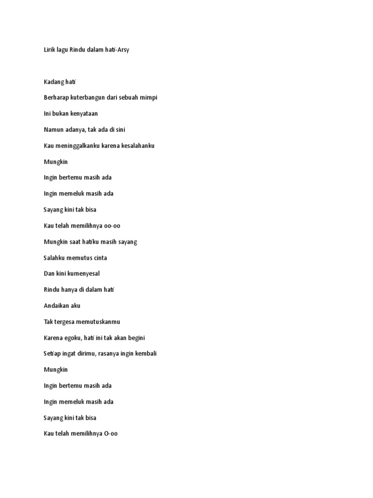 Aku mula rindu rindu dalam hati aku jika sayang sayang sepenuhnya jangan engkau pergi jangan engkau jauh dari hati. Aku sungguh percaya yesus ku kau hadir dalam sakramen mahakudus aku ingin memeluk mu persatukan diriku dengan mu aku ingin memeluk mu jangan biarkan ku terpisah dari mu 2. Adalah ungkapan perasaan yang timbul didalam hati dalam artian keinginan untuk bertemu untuk melihat untuk mendengar untuk merasa kepada objek tertentu kepada yang dielu elukan yang didamba yang dipuja.