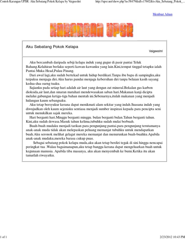 Aku sebatang pokok kelapa karangan. Contoh karangan upsr aku sebatang pokok kelapa by vaigeeshri. Apabila besar aku amat berguna kepada manusia. Akak saya cakap jangan marah ya walhal anti sebelah tuh sebaya mak kc boleh dia panggil aku akak kc. Pada musim kemarau baru aku disiram.
