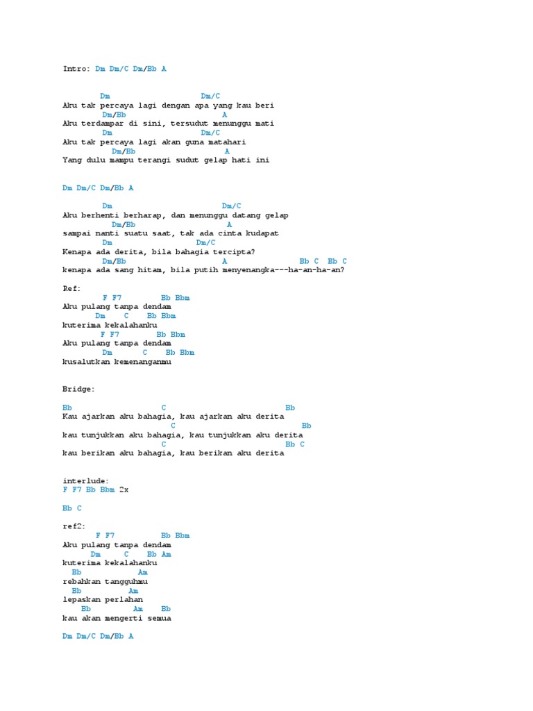 Aku pulang tanpa dendam ku terima kekalahanku. Aku berhenti berharap dan menunggu datang gelap sampai nanti suatu saat tak ada cinta yang ku dapat. Am aku tak percaya lagi g akan guna matahari f yang dulu mampu terangi e sudut gelap hati ini. Aku tak percaya lagi g dengan apa yang kau beri f aku terdampar di sini e tersudut menunggu mati.