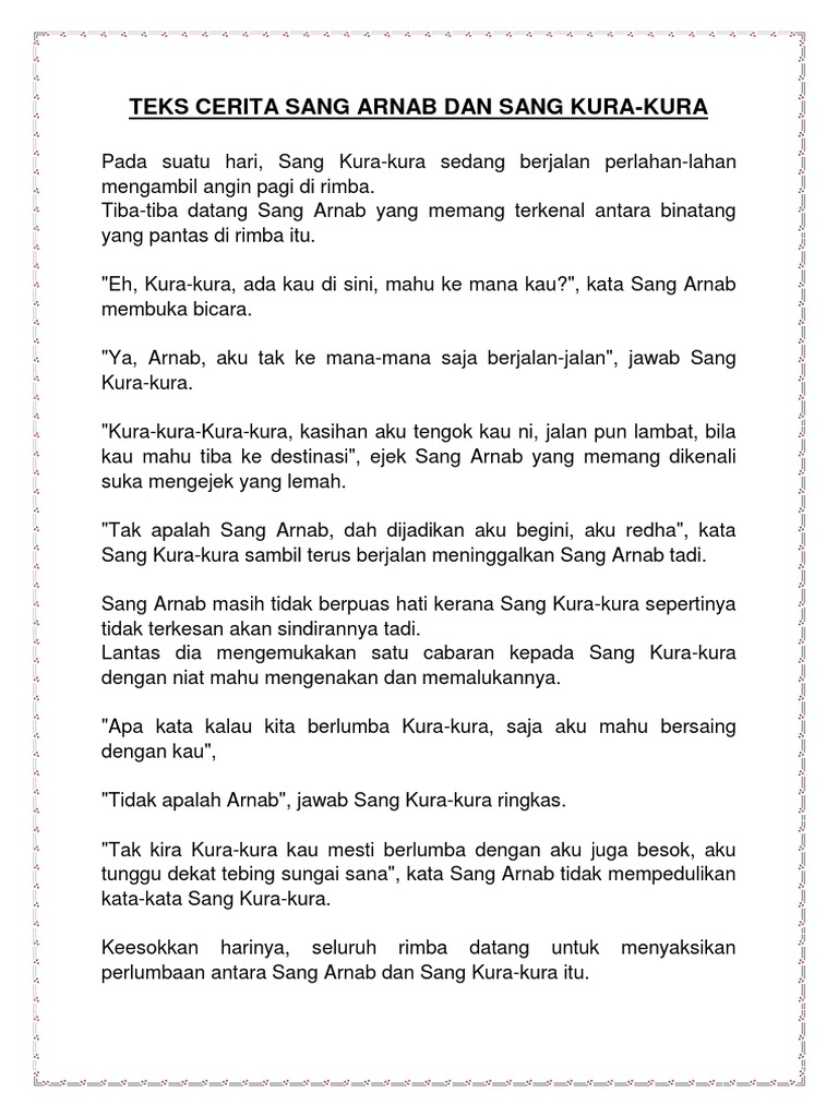 Arnab dan kura kura cerita pendek. Pasti menggamit nostalgia dan. Setelah lama berjalan arnab keletihan lalu merehatkan diri dibawah sepohon pokok yang besar dia sudah puas mencari namun tiada satu pun binatang kecil yang dijumpainya arnab berasa sangat kecewa walaupun begitu kekecewaan arnab tidak berpanjangan kerana seekor kura kura muncul dan berjalan kearah bertentangan dengannya arnab terus kembali ceria. Oleh karenanya cerita pendek anak ini disebut dongeng hewan atau fabel. Setibanya di seberang sungai mereka bertukar posisi sekali lagi dan sampai ke garisan penamat dengan jayanya.