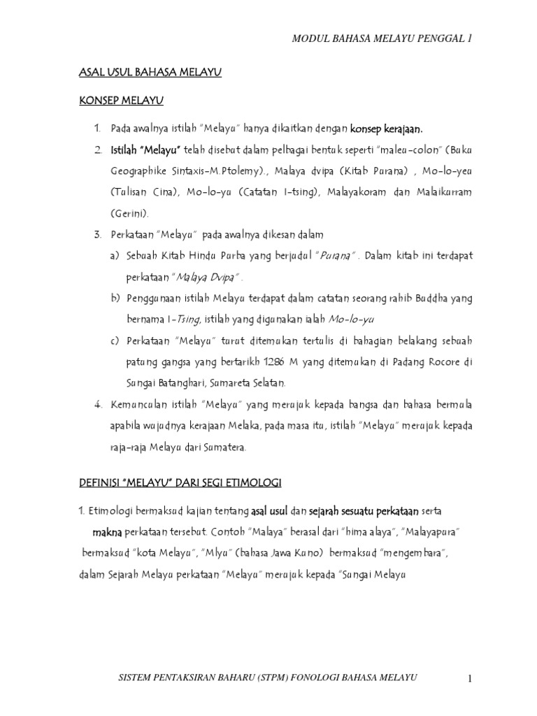 Asal usul bahasa melayu stpm. Definisi melayu dari segi etimologi etimologi. Kajian asal usul dan sejarah sesuatu perkataan serta makna perkataan tersebut. Filum austris ini menurunkan rumpun bahasa austronesia austroasia dan tibet china bahasa melayu adalah daripada keturunan bahasa austronesia. Buku sejarah melayu mengaitkan perkataan melayu dengan nama sebatang sebatang sungai yang deras alirannya iaitu sungai melayu.