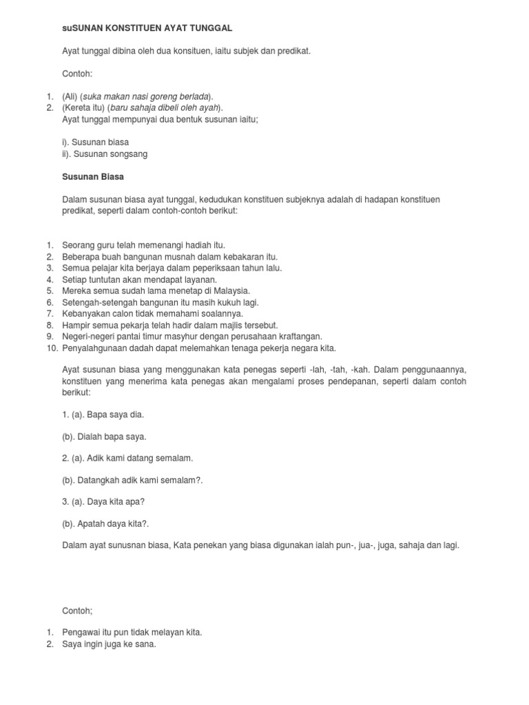 Susunan songsang susunan biasa dalam susunan biasa ayat tunggal kedudukan konstituen subjeknya adalah di hadapan konstituen predikat seperti dalam contoh contoh berikut. Contoh ayat tunggal susunan biasa tahun 3 perotoh. Subjek penerang subjek predikat penerang predikat cont. Ali suka makan nasi goreng berlada.
