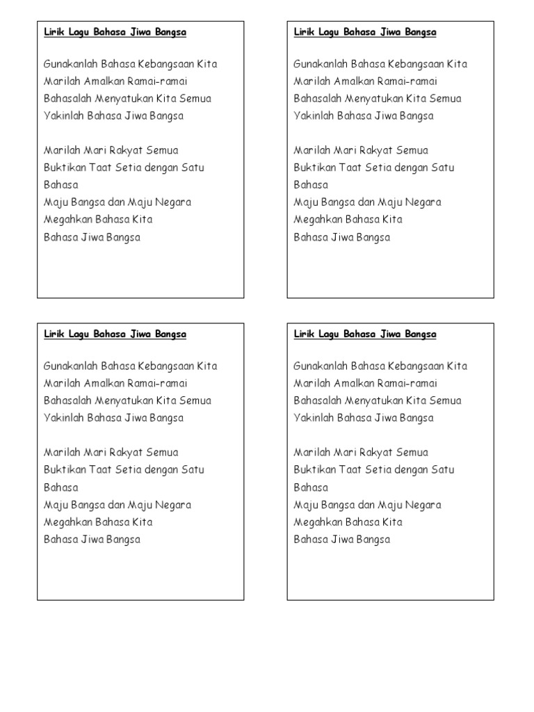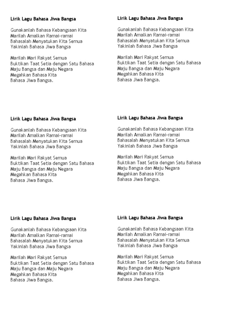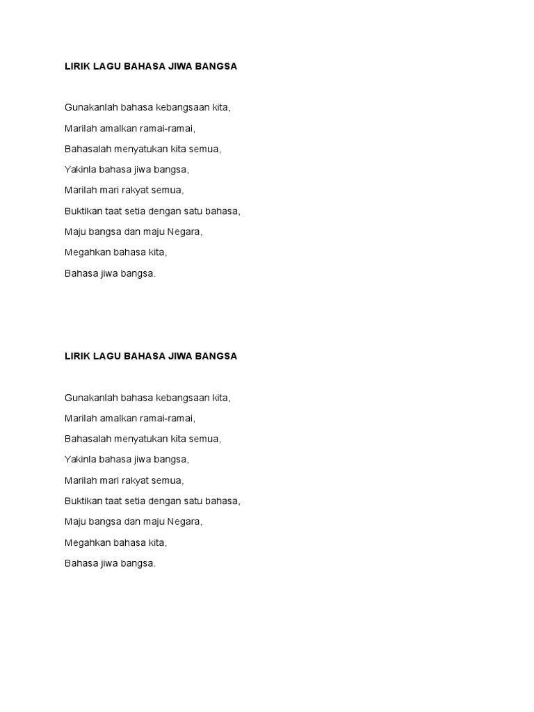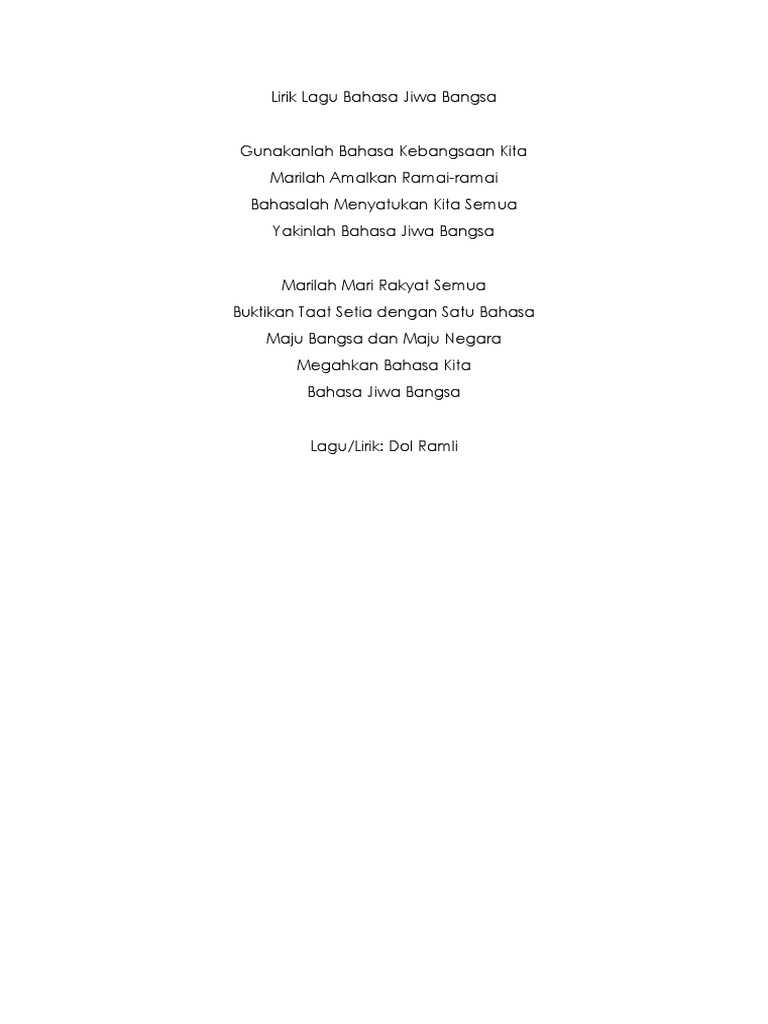 Masa mamat ni nyanyi lagu 1 malaysia beliau pegang bendera dan nyanyi dengan hafal lirik uollss sedangkan lirik lagu tu berbunyi. Lirik lagu bahasa jiwa bangsa sumber gambar. Lirik lagu bahasa jiwa bangsa gunalah bahasa kebangsaan kita marilah amalkan ramai ramai bahasalah menyatukan kita semua yakinlah bahasa jiwa bangsa marilah mari rakyat semua buktikan taat setia dengan satu bahasa maju bangsa dan maju negara megahkan bahasa kita. Lirik lagu bahasa jiwa bangsa.
