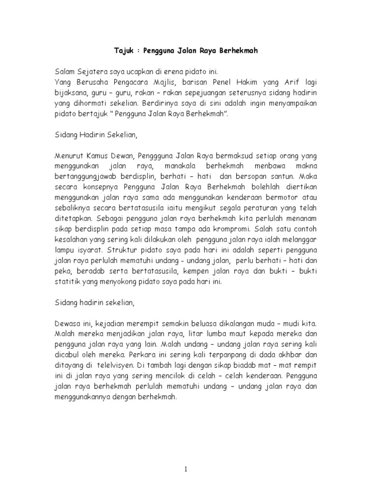 Bersopan santun di jalan raya karangan. Selamat sejahtera saya ucapkan kepada yang dihormati tuan pengerusi majlis tuan guru besar barisan hakim yang adil lagi bijaksana guru guru serta rakan rakan sekalian. Semua orang merasa penting dan patut didahului. Pendidikan di rumah memainkan peranan penting dalan membentuk peribadi anak anak supaya patuh bersopan santun. Tajuk syarahan ialah pentingnya sikap berhati hati di jalan raya.