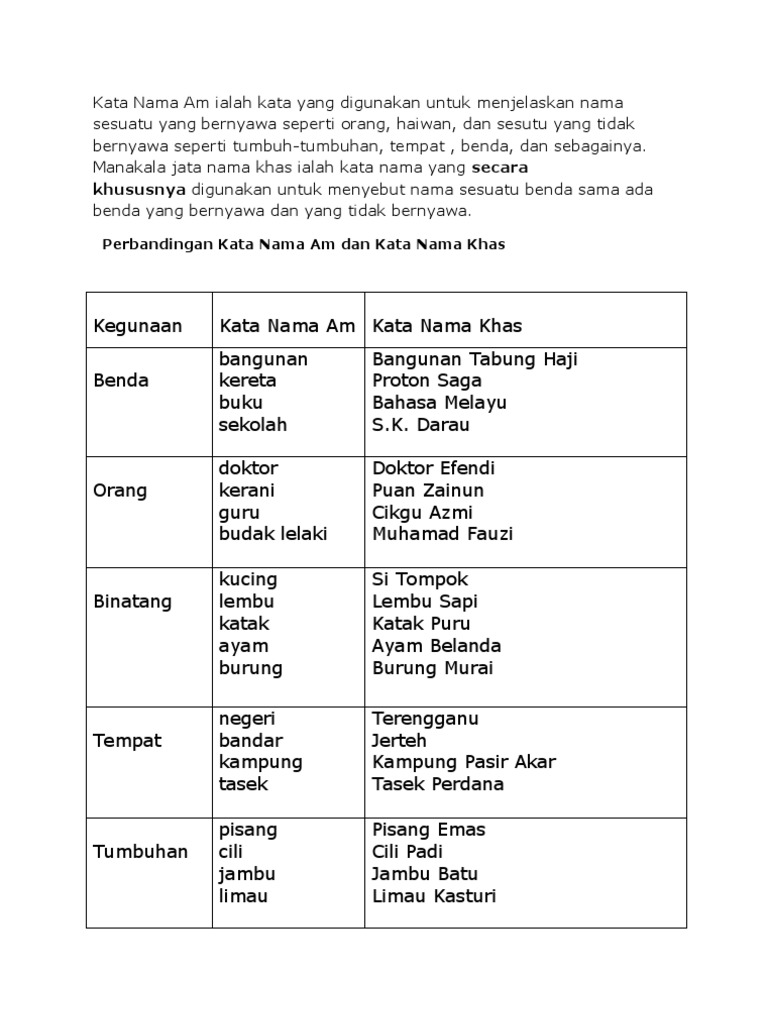 Binatang kata nama khas haiwan. Kata nama khas menggunakan huruf besar pada huruf awal. 2 rasyidah brendan eileen puteri farhana maddie tompok biring rafflesia chua chu kang ahad west mall korea selatan proton saga planet utarid bernyawa tak bernyawa. Kata ganti nama 1 kata nama am merupakan kata nama yang merujuk sesuatu secara umum dan tidak dimulakan dengan huruf besar. Kata nama khas kata yang menyatakan nama benda haiwan haiwan manusia tempat secara khusus dan sebagainya sama ada bernyawa ataupun tidak bernyawa.