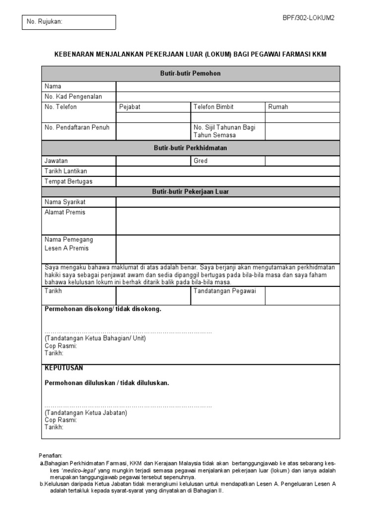Borang bertugas di luar ibu pejabat borang bertugas di luar waktu pejabat surat arahan bertugas lebih masa surat tawaran lantikan penempatan pertukaran geran kenderaan surat kebenaran pemilik surat kelulusan bhg. Borang permohonan untuk bertugas diluar ibu pejabat borang ini hendaklah diisi dalam 2 salinan sebelum perjalanan dilakukan 1. Borang permohonan baru 1govnet bpm kkm ver1. Jarak perjalanan yang melebihi 240 km sehala dari ibu pejabat adalah layak dipertimbangkan elaun tambang gantian kapal terbang atau keretapi.