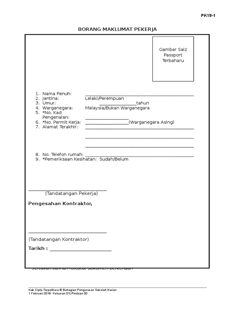 Borang maklumat pekerja baru. Nama pekerja nombor rujukan tap jantina kelulusan nombor kad pintar tarikh lahir jawatan gaji yang l p ditawarkan. Nombor fail cukai pendapatan j ika ada 5. 2 pjb 3000 213 3 ld1 jabatan buruh kementerian hal ehwal dalam negeri negara brunei darussalam bab 112 perintah pekerjaan 2009. C i borang potongan untuk skim insurans.