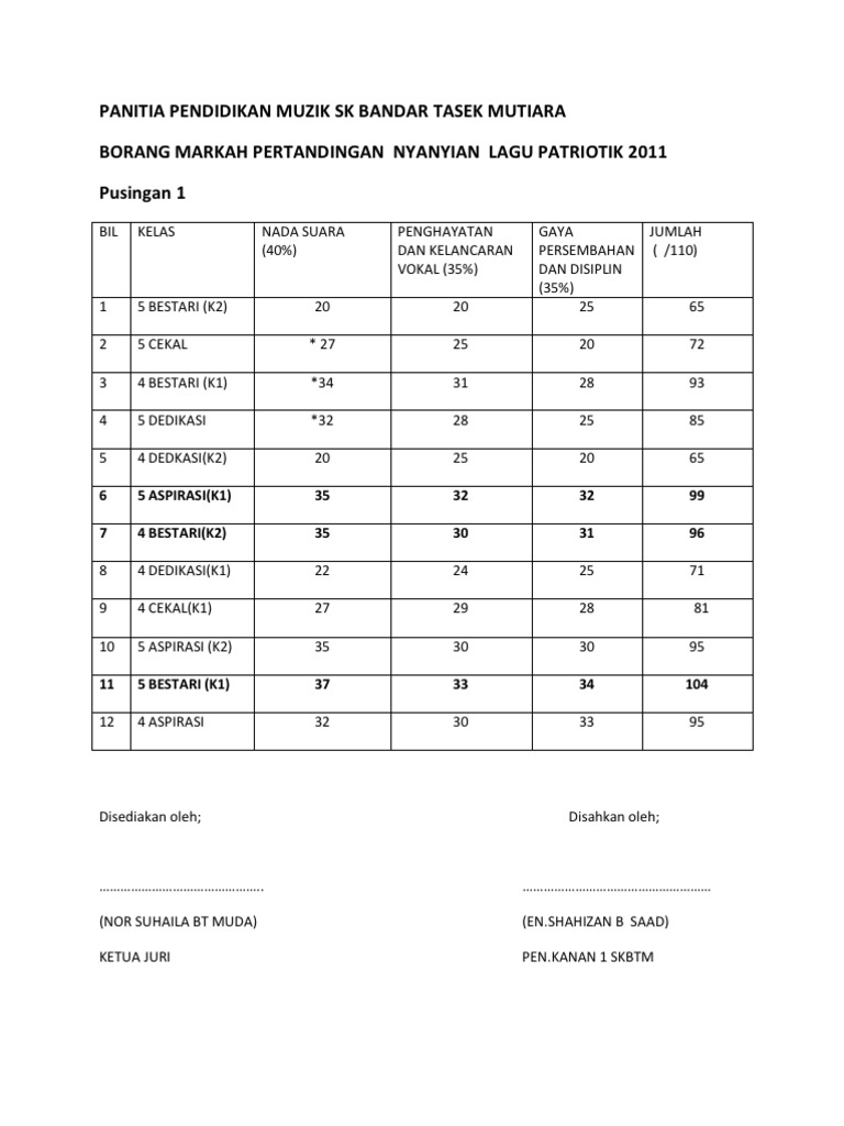 Borang pemarkahan juri pertandingan nyanyian. Academia edu is a platform for academics to share research papers. Nama peserta pic 20 m tempo 15 m sebutan. 5 markah jumlah. Nor suhaila bt muda ketua juri en shahizan b saad pen kanan 1 skbtm panitia pendidikan muzik sk bandar tasek mutiara borang markah pertandingan nyanyian lagu patriotik 2011 pusingan akhir bil kelas nada suara 40 penghayatan dan kelancaran vokal 35 gaya jumlah persembahan 110 dan disiplin 35 1 2 3.