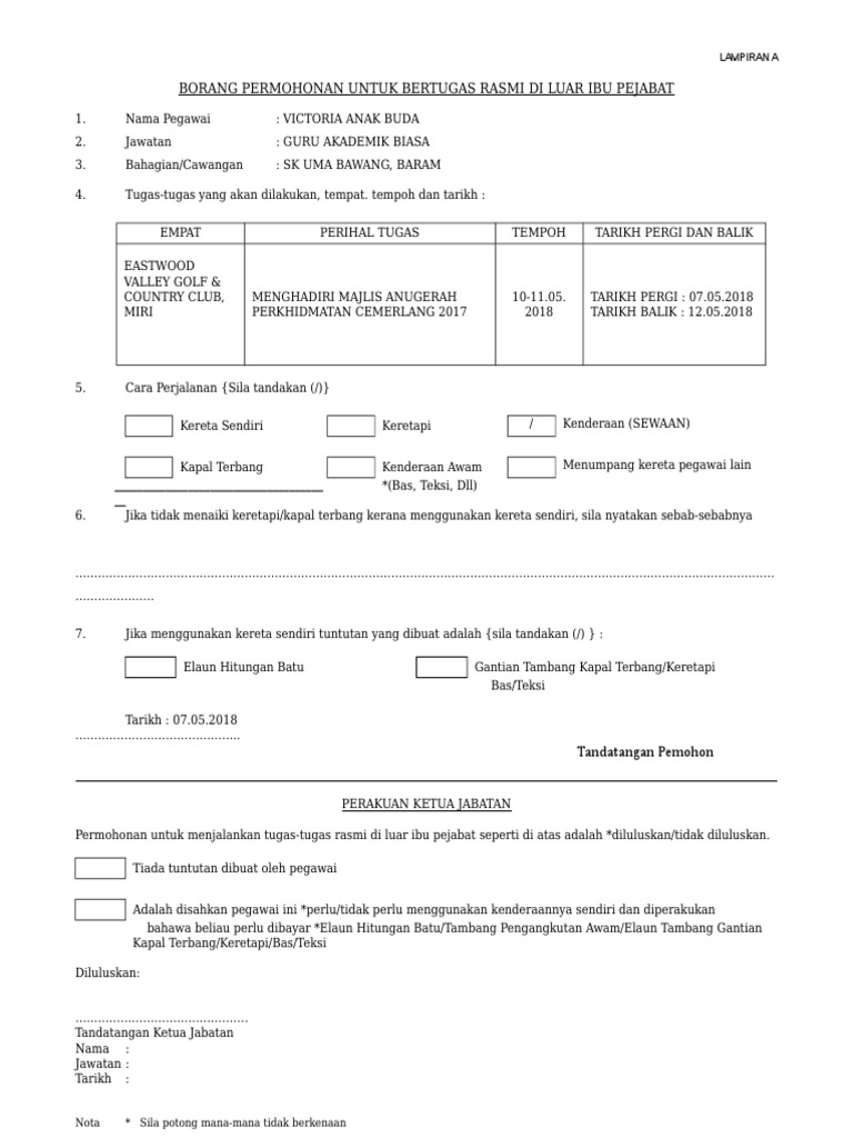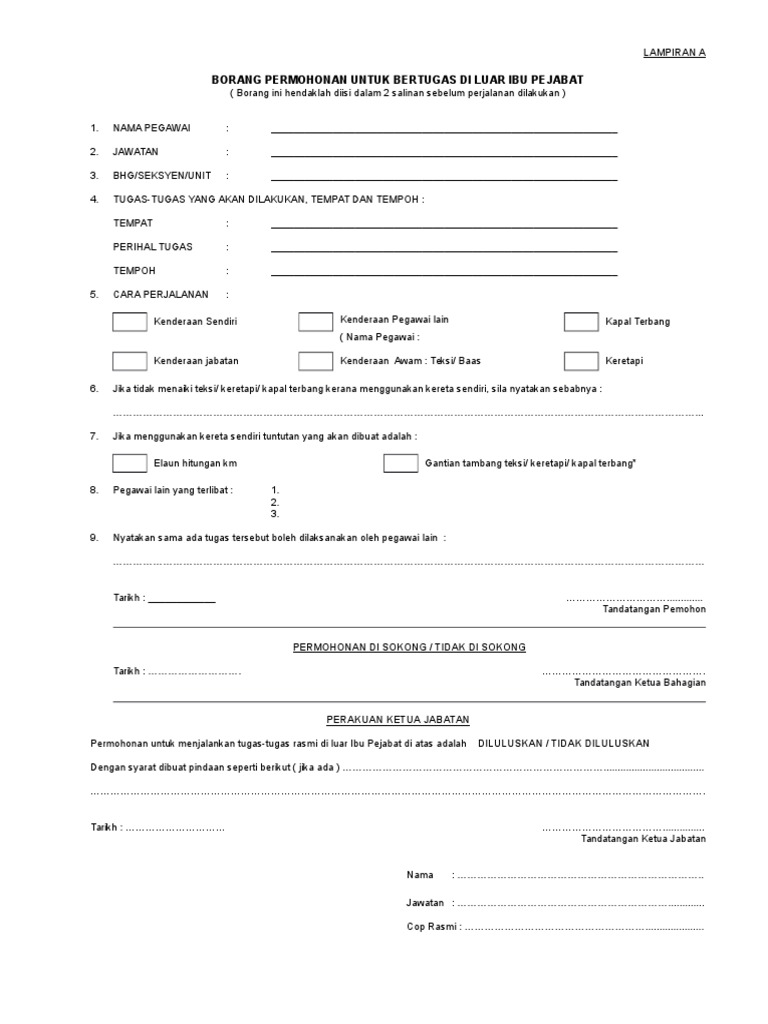 Borang permohonan bertugas di luar pejabat lampiran a. Tuntutan perjalanan bertugas rasmi di dalam negeri para 4 1 a. 4 tugas tugas yang akan dijalankan tempat dan tempoh tempat perihal tugas tarikh 5. Lampiran a borang permohonan untuk bertugas rasmi di luar pejabat dan kebenaran membawa kenderaan sendiri 1pp wp 1 4 1. Tugas tugas yang akan dilakukan tempat tempoh dan tarikh.