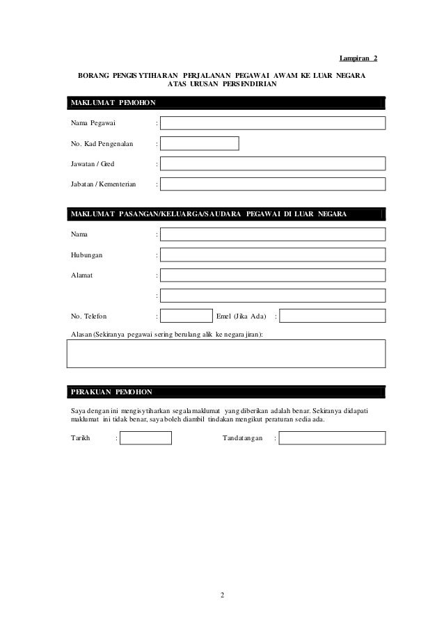 Borang permohonan keluar negara urusan persendirian 2020. Permohonan keluar negeri atas urusan persendirian ini hendaklah diisi dua 2 minggu sebelum pemohon keluar negeri. Permohonan perjalanan ke luar negara pegawai pegawai kkm. Capaian garis panduan dan borang permohonan ke luar negara persendirian adalah seperti berikut. Lampiran 2 borang pengisytiharan perjalanan pegawai awam ke luar negara atas urusan persendirian.