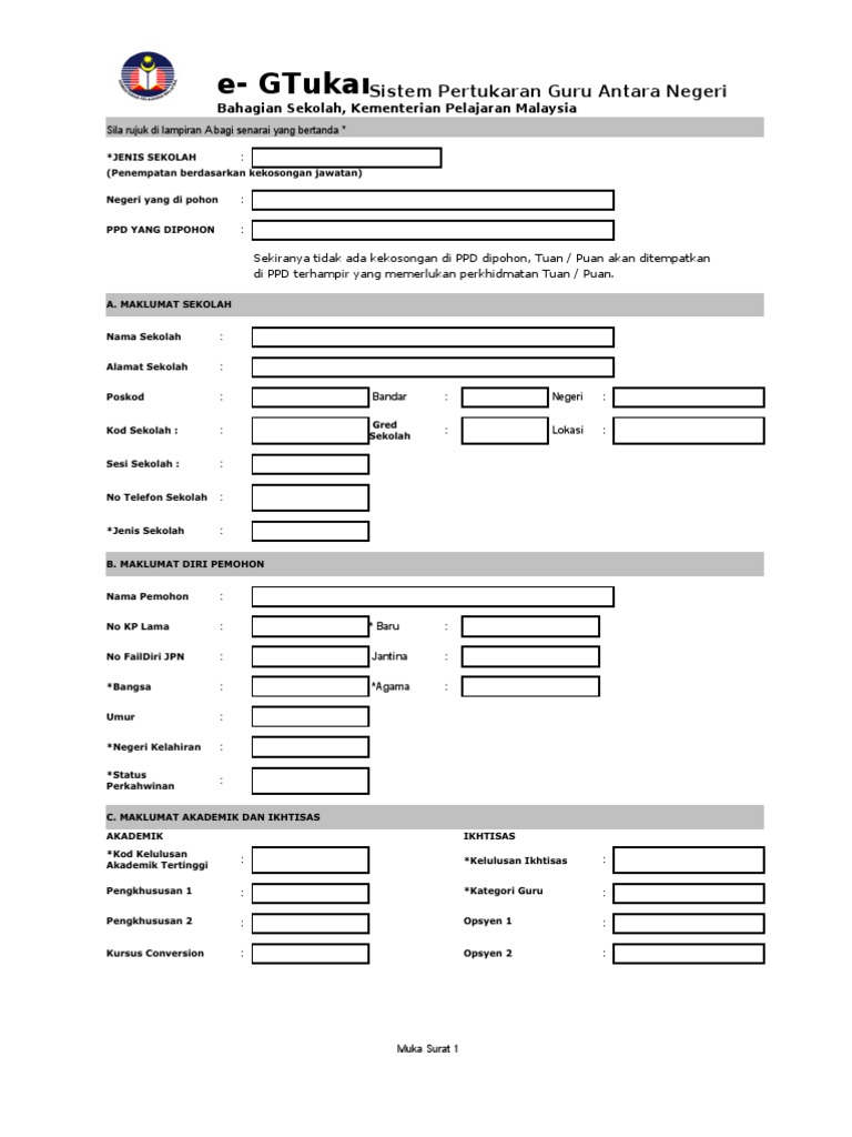 Muka surat 2 sistem pertukaran guru antara negeri. Sehubungan dengan itu sebarang pertanyaan boleh hubungi unit sekolah rendah sps di talian 05 5015110 5111. Sila klik di sini untuk muat turun borang tersebut yang telah dibuat dalam format ms excell untuk memudahkan tuan puan. Muka surat 2 e gtukar sistem pertukaran guru antara negeri bahagian sekolah kementerian pelajaran malaysia d.