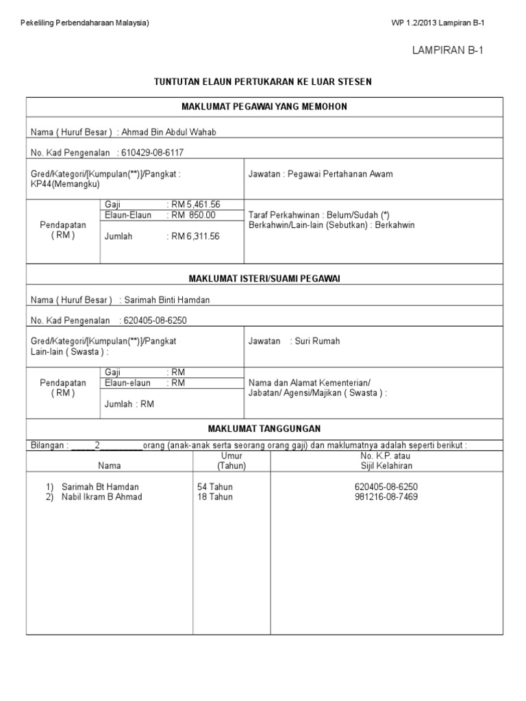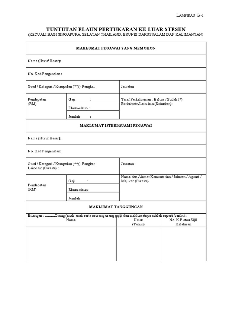Borang tuntutan elaun pertukaran ke luar stesen lampiran b 1. Tuntutan elaun pertukaran ke luar stesen kecuali bagi singapura selatan thailand brunei darussalam dan kalimantan maklumat pegawai yang memohon. So sesiapa yang nak pindah payah nak cari form claim. Rm kerugian pertukaran matawang asing 3. Syarat syarat membuat tuntutan elaun kemudahan dan bayaran adalah seperti berikut.