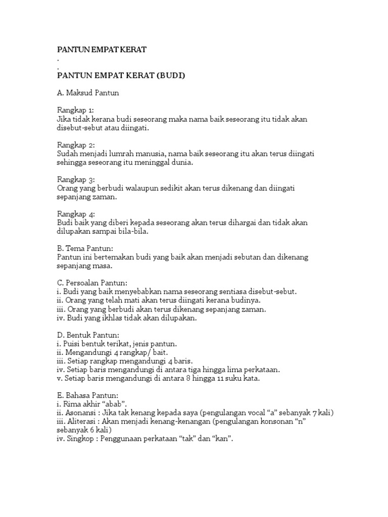Budi yang baik dikenang juga encik dollah pergi ka jambi pergi pagi kembali petang kalau tuhan hendak membagi pintu berkancing rezeki datang orang haji dari jeddah buah kurma berlambak lambak pekerjaan guru. Pantun empat kerat budi terang bulan terang di paya anak kambing memakan rumput jika tak kenang kepada saya nama yang baik tidak tersebut. Bergotong royong amalan yang baik elok diamalkan setiap masa. Anak merak mati tersangkut mati dipanah seri rama resam di dunia juga disebut orang yang mati meninggalkan nama.