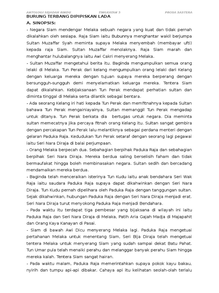 Burung terbang dipipiskan lada nota komsas. Sinopsis tema dan persoalan binaan plot teknik plot watak perwatakan latar tempat masyarakat masa gaya bahasa nilai dan pengajaran sinopsis prosa tradisional burung terbang dipipiskan lada kedengaran ke benua siam bahawa negeri melaka sebuah negeri yang besar dan tidak ditakluki oleh mana mana empayar. Prosa tradisional burung terbang dipipiskan lada ini merangkumi nota bagi sinopsis tema dan persoalan watak dan perwatakan teknik plot plot gaya bahasa nilai dan pengajaran. Thank you its very helpful. Ceritanya bermula pada zaman dahulu kala negeri siam yang dikenali sebagai syahrunnuwi begitu kuat sehingga semua kerajaan bawah angin telah ditakluki oleh siam kecuali.