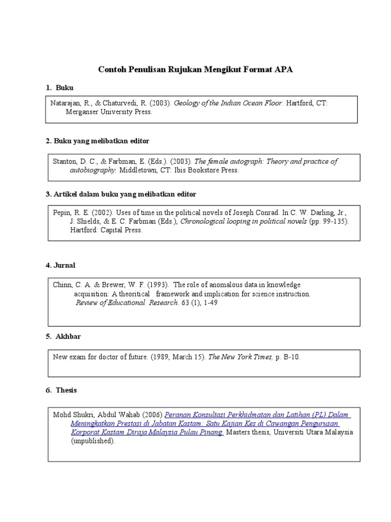 Contoh contoh gaya apa dan format yang disenaraikan di halaman ini merangkumi banyak jenis yang paling biasa daripada sumber yang digunakan dalam penyelidikan akademik. Banyak organisasi menggunakan format apa american psychological association untuk mengutip referensi terutama dalam bidang ilmiah. Kajian sosial murid murid luar bandar. Untuk setiap penanda rujukan perlu ada rujukan sepenuhnya dalam senarai rujukan dan begitu juga sebaliknya.