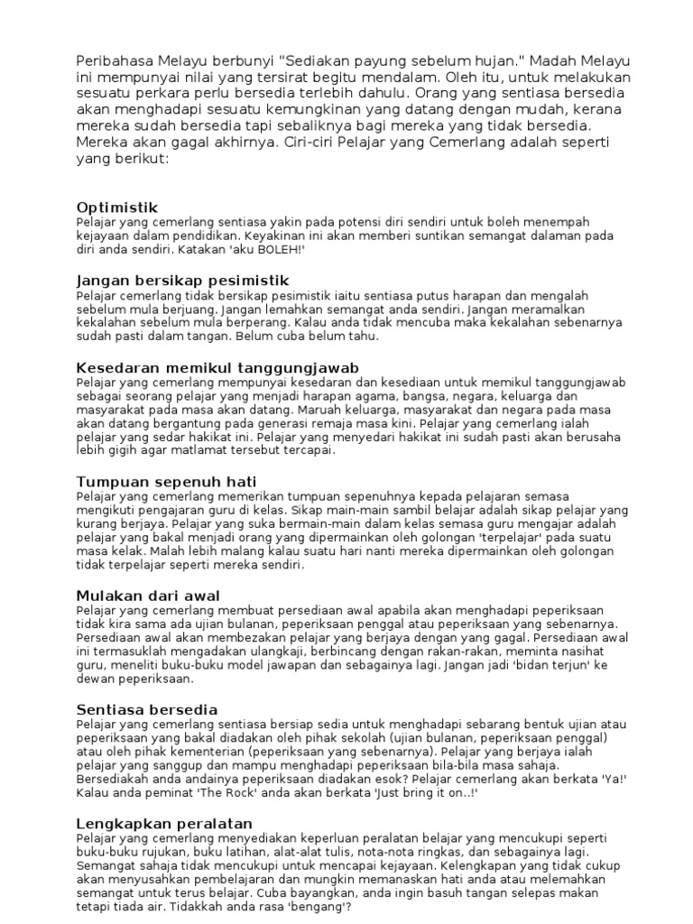 Ciri ciri murid cemerlang kecemerlangan dalam bidang akademik merupakan idaman dan impian setiap pelajar. Contoh karangan terbaik ciri diri murid yang cemerlang akhlak yang perlu ada untuk berjaya. Murid murid perlu berusaha dengan bersungguh sungguh untuk menjadi murid cemerlang. Karangan ciri ciri pelajar cemerlang antara karangan yang agak popular tidak kiralah di sekolah rendah sekolah menegngah upsr pt3 mahupun spm.