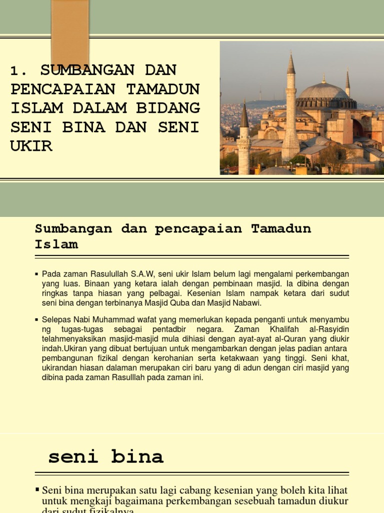 Senibina islam awal dipengaruhi oleh romawi byzantine persia mesopotamia dan semua tanah yang ditakluki umat islam pada abad ke 7 dan ke 8. Perkembagan tamadun islam tidak dapat lari daripada keagungan seninya termasuklah seni ukiran khat bina dan sebagainya. Tamadun islam bersifat kewahyuan. Ciri ciri khusus tamadun islam.