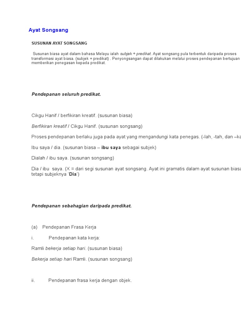 Ayat songsang merupakan salah satu topik di dalam subjek bahasa melayu bm. Penyongsangan dapat dilakukan melalui proses pendepanan bertujuan memberikan penegasan kepada predikat. Ayat susunan biasa juga dikenali sebagai ayat biasa. Cikgu hanif berfikiran kreatif.