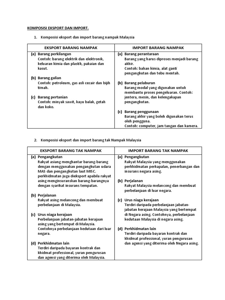 7 contoh kegiatan ekspor indonesia ke negara lain indonesia menjadi negara pengekspor berbagai komoditas penting yang dibutuhkan dunia. Contoh laporan kerja kursus ekonomi stpm 2018. Walaupun malaysia menunjukkan prestasi yang baik dalam eksport dan import ia adalah penting bagi orang untuk mengetahui peraturan dan proses kedua dua eksport dan import dalam malaysia. Selain itu dasar ini juga mempelbagai dan memperkukuhkan eksport barangan malaysia untuk mengatasi dasar perlindungan yang ada di negara negara maju terhadap barangan daripada negara membangun.
