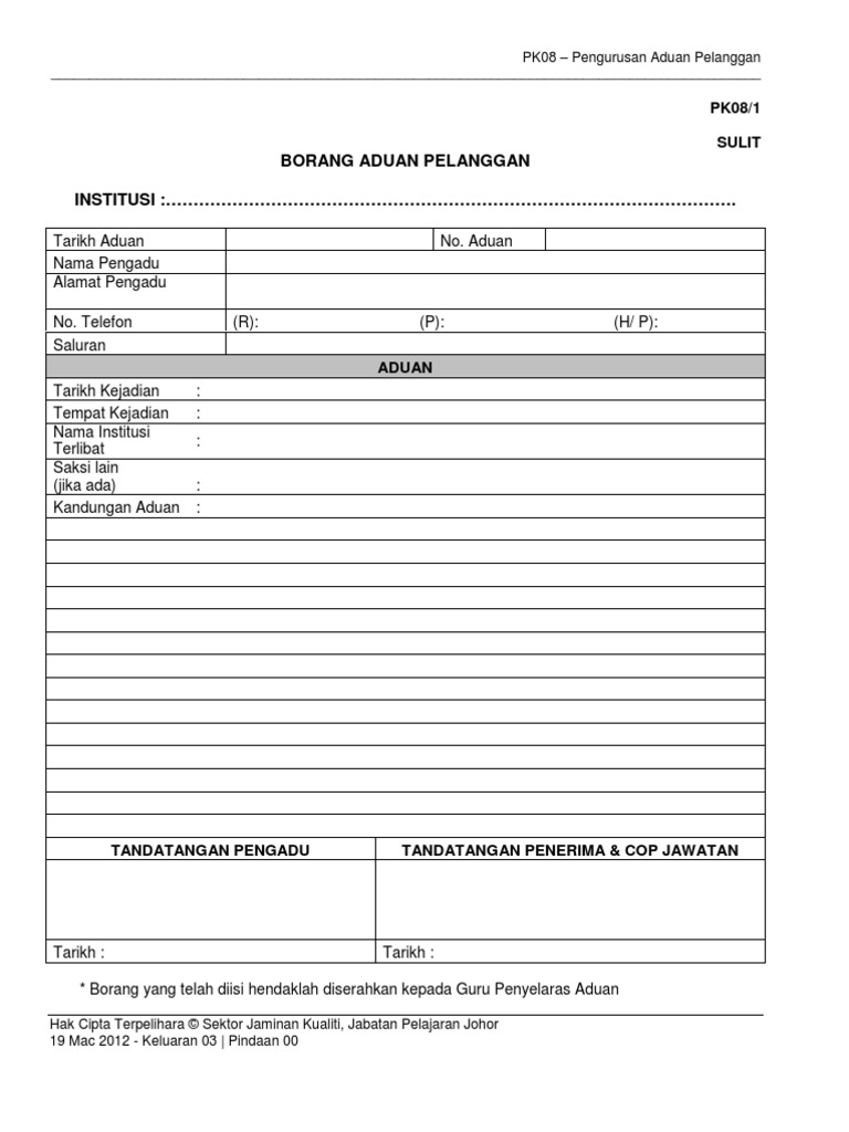 Simpan simpan borang maklum balas pelanggan untuk nanti. Borang aduan maklum balas pelanggan a. Borang aduan dan maklumbalas pelanggan butiran pengadu. Pelanggan datang sendiri surat borang dari peti cadangan melalui telefon mel elektronik dialog perjumpaan tertentu media cetak lain lain.