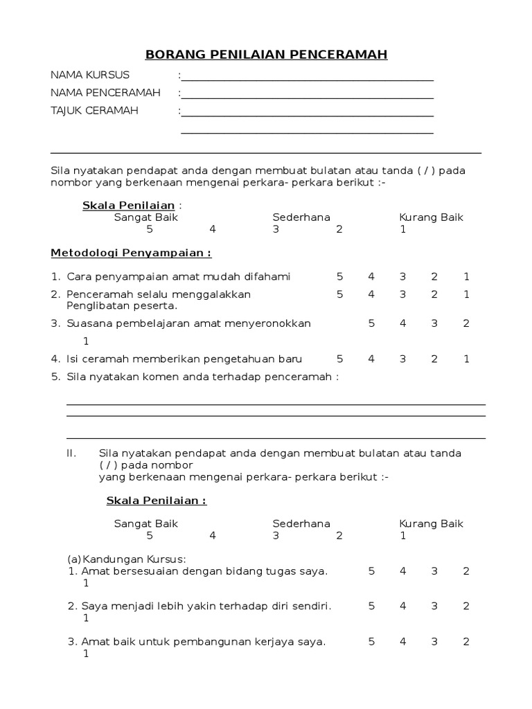 Contoh borang penilaian program ceramah. Dengan menggunakan skala berikut isikan angka berkenaan ke dalam petak yang disediakan. Borang penilaian tajuk program. Suasana tempat kursus yang kondusif. 1 sangat tidak memuaskan 2 kurang memuaskan 3 sederhana 4 memuaskan 5 sangat memuaskan 1.