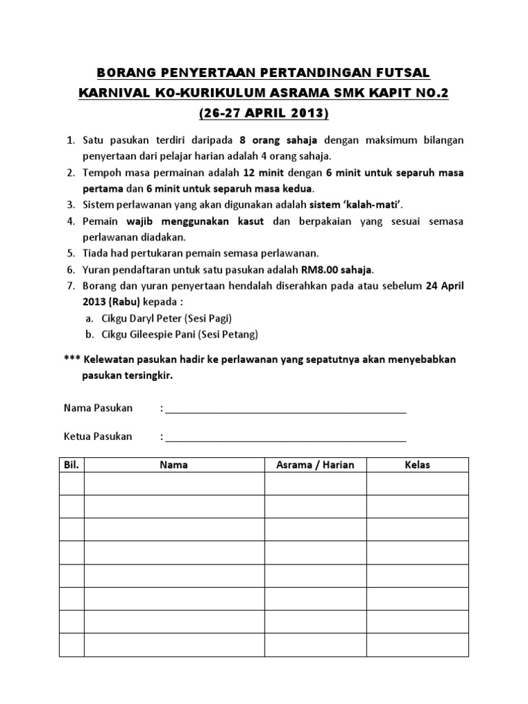 Contoh borang penyertaan pertandingan futsal. Institut pendidikan guru ipg. Syarat syarat penyertaan dan peraturan perlawanan futsal anjuran kelab perkhidmatan awam syarat syarat penyertaan 1. Bertempat di impact futsal salak south. Ching viviyanti ching hasan created date.