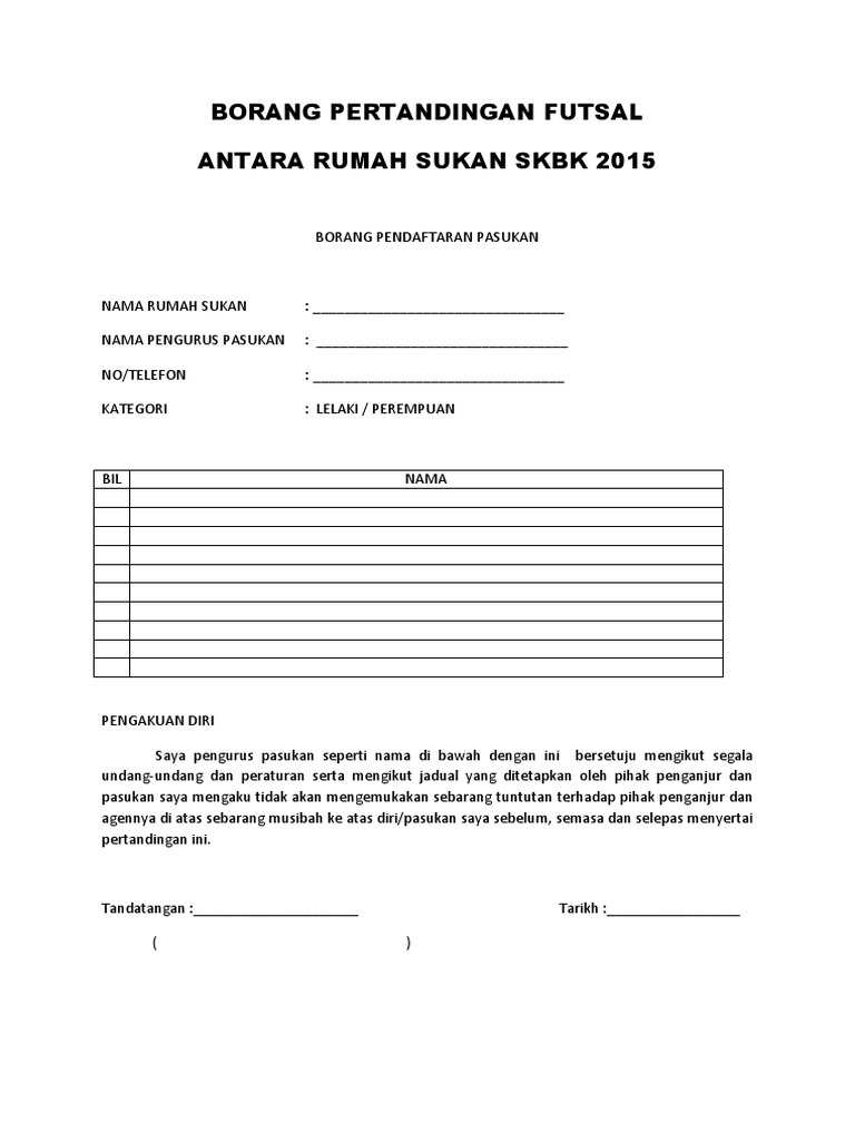 Nama pemain yang mengganti. Borang penyertaan yang lengkap berserta yuran penyertaan rm 110 00 tunai diserahkan kepada. Demikian pernyataan ini saya buat dengan sesungguhnya dan dengan penuh kesadaran. Setiap pasukan hanya dibenarkan mendaftarkan 8 orang pemain.