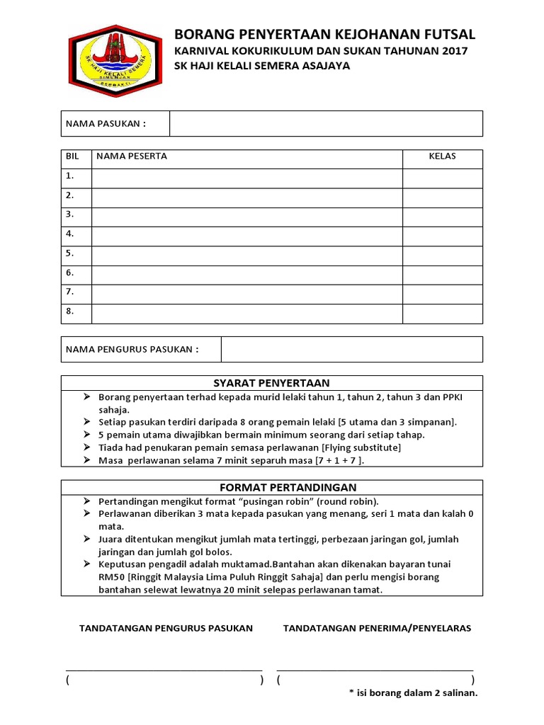 Pembayaran yuran penyertaan adalah secara tunai. Borang penyertaan pertandingan futsal author. Sebarang pertukaran pemain hendaklah meminta borang pertukaran pemain dahulu di tempat penyelia peserta. Nama pemain yang ditukar.