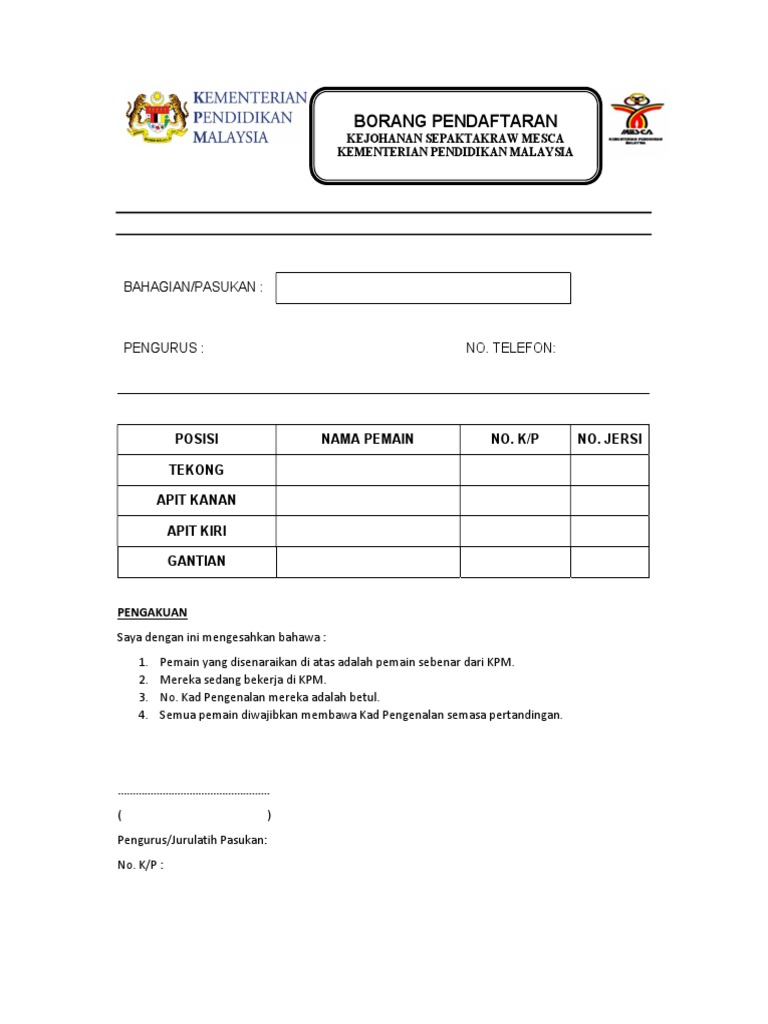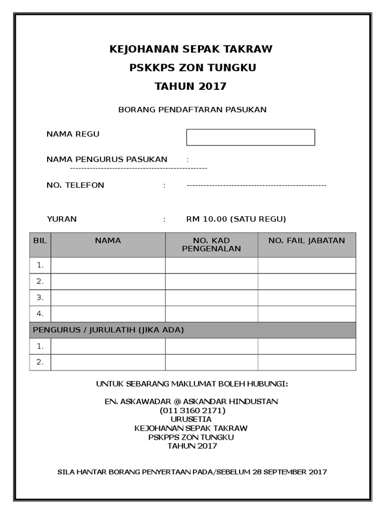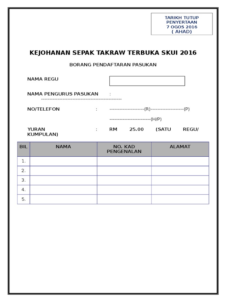Contoh borang penyertaan pertandingan sepak takraw. 26 hingga 28 september 2016 masa. Borang rekod kiraan mata sukan permainan. 3 1 hanya pemain pemain yang didaftarkan dalam borang penyertaan sahaja dibenarkan bermain di sepanjang pertandingan ini. Permainan akan dijalankan secara regu 3 2 semua pemain diwajibkan membawa bersama pas pekerja surat.