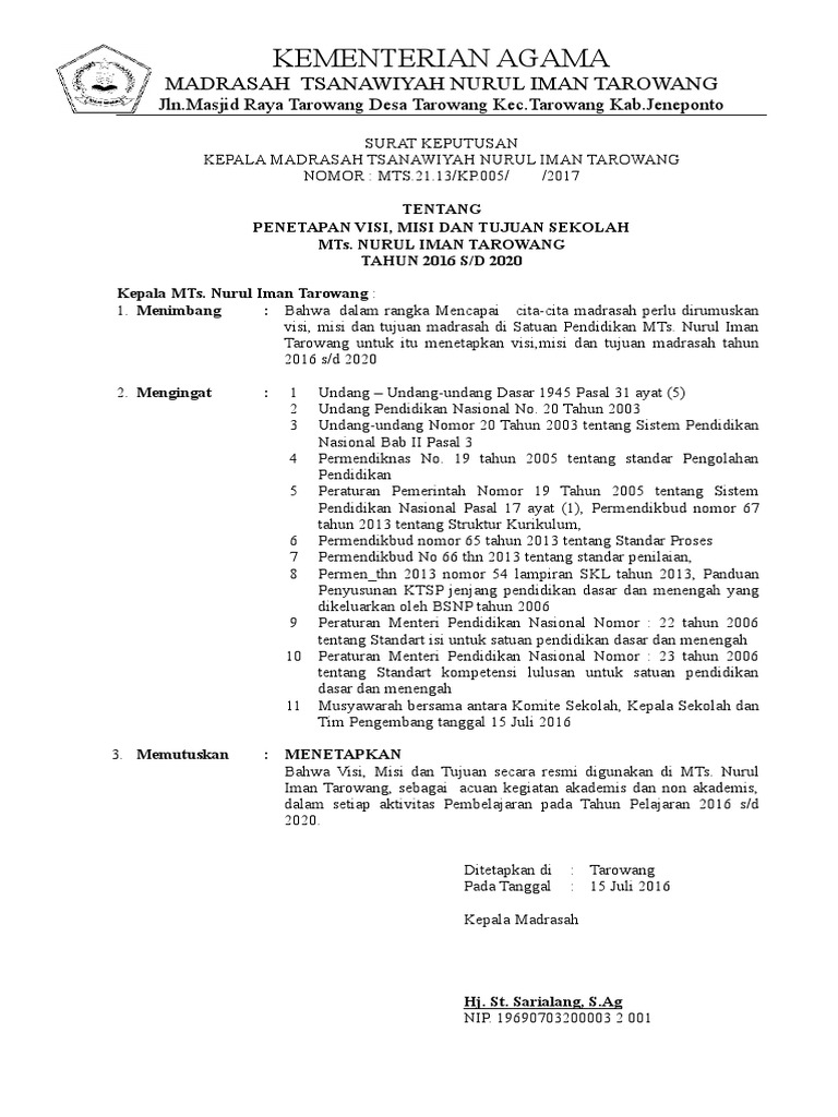 Perumusan penetapan dan peninjauan kembali terhadap visi misi dan tujuan sekolah merupakan kegiatan wajib yang harus ditempuh sekolah terutama sekolah baru. Visi ini memberikan wawasan yang menjadi sumber arahan bagi sekolah dan digun a kan untuk memandu perumusan misi sekolah. Terwujudnya peserta didik yang beriman cerdas terampil mandiri dan berwawasan global. Contoh sk penetapan visi misi dan tujuan sekolah bentuk file word dala perogram kerja sebuah sekolah syarat utamanya adalah uahrus merumuskan tentang penetapan visi misi dan tujuan lembaga dalam perumusan ini sebagai bahan acuan dalam penyusunanya adalah memiliki sk penetapan visi misi dan tujuan sekolah mungkin banyak diantara kita yang kebingungan dalam membuat sk visi misi dan tujuan.