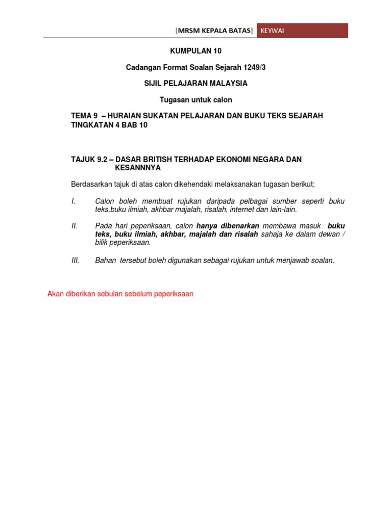 Click to download contoh soalan kertas 3 tingkatan 4 beserta jawapan skema cikgu mahf. Dasar british dan kesannya terhadap ekonomi negara. Galakan dasar british memberi galakan kepada pemodal asing untuk memperluaskan. Berikut dikongsikan skema jawapan sejarah kertas 3 tingkatan 4 dan 5 setiap bab yang boleh dirujuk dan di muat turun dalam file pdf di bawah ini.