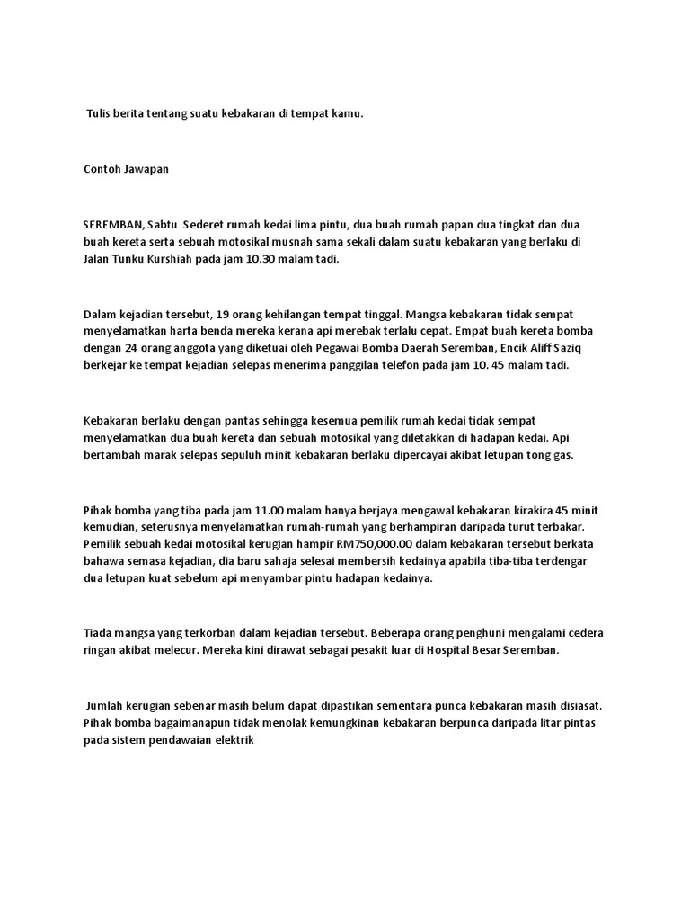 Karangan pt3 kebakaran anda telah menyelamatkan anak jiran anda daripada hangus dijilat api dalam satu kebakaran di kawasan tempat tinggal anda. Contoh jurnal inilah contoh karangan berita kebakaran yang anda perlukan. Contoh karangan jenis berita. Contoh teks berita singkat tentang kebakaran.