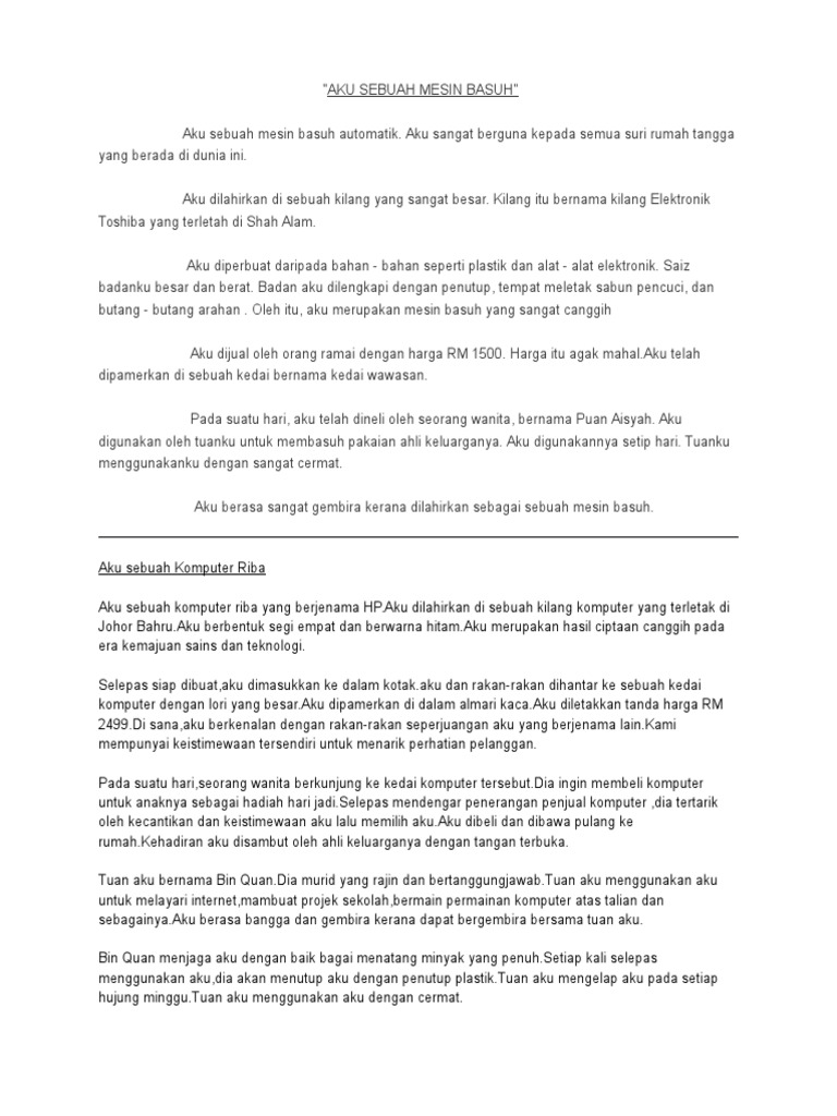 Contoh karangan pendek aku sebuah komputer riba. Aku sebuah komputer riba yang berjenama hp aku dilahirkan di sebuah kilang komputer yang terletak di johor bahru aku berbentuk segi empat dan berwarna hitam aku merupakan hasil ciptaan canggih pada era kemajuan sains dan teknologi. Karangan ini ditulis oleh murid 6d 2011 sia wei cong. Contoh karangan aku sebuah komputer riba contoh karangan aku sebuah basikal contoh karangan aku sebuah kereta contoh karangan aku sebuah komputer contoh karangan aku sebuah telefon bimbit contoh karangan aku sebuah buku contoh karangan aku sebuah beg sekolah contoh karangan aku sebuah robot contoh karangan aku sebuah jam tangan contoh. Aku sebuah komputer riba aku dilahirkan di sebuah kilang di kawasan perindustrian bedok dalam tahun 2008.