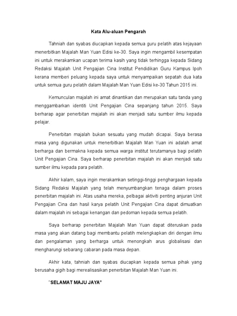 Contoh kata kata aluan majalah formal writing of senior officer kata alu aluan untuk majalah sekolah. Antara contoh ungkapan indah bagi kata alu aluan atau ucapan alu aluan yang biasa terdapat dalam teks ucapan yang dimuatkan dalam buku cenderamata atau program sesuatu majlis ialah sekapur sirih seulas pinang setitis tinta seuntai madah seuntai bahasa secebis bicara semanis madah seungkap rasa sejambak bicara dan sebagainya. Saya menjulang sepenuh penghargaan kepada ustaz abdul aziz hajrin pensyarah ctu551 bagi kelas saya di atas kesudian beliau memberi tugasan ini kepada saya dan rakan sekelas yang lain. Kata kata aluan alhamdulillah hirabbil alamin saya merafakkan sepenuh kesyukuran kehadrat ilahi dengan limpah dan kurnianya dapat saya menyelesaikan tugasan kerja khusus ini dengan penuh jayanya.