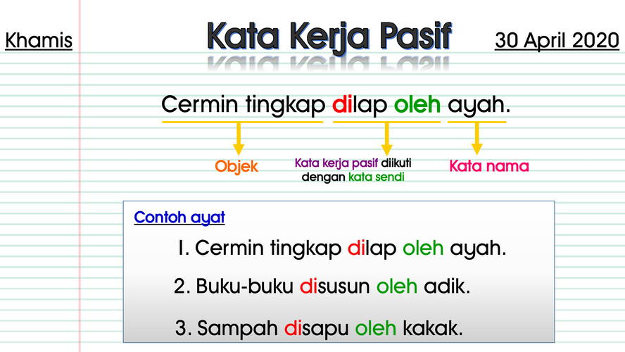 Kata kerja pasif biasanya mendapat imbuhan di seperti. Seperti halnya kalimat aktif kalimat pasif juga dibagi menjadi dua jenis yakni kalimat pasif transitif dan intransitif. Wang syiling dimasukkan oleh zarul ke dalam mesin pengering pakaian. Pada umumnya kata kerja didahului dengan kata ganti orang ku dan kau.