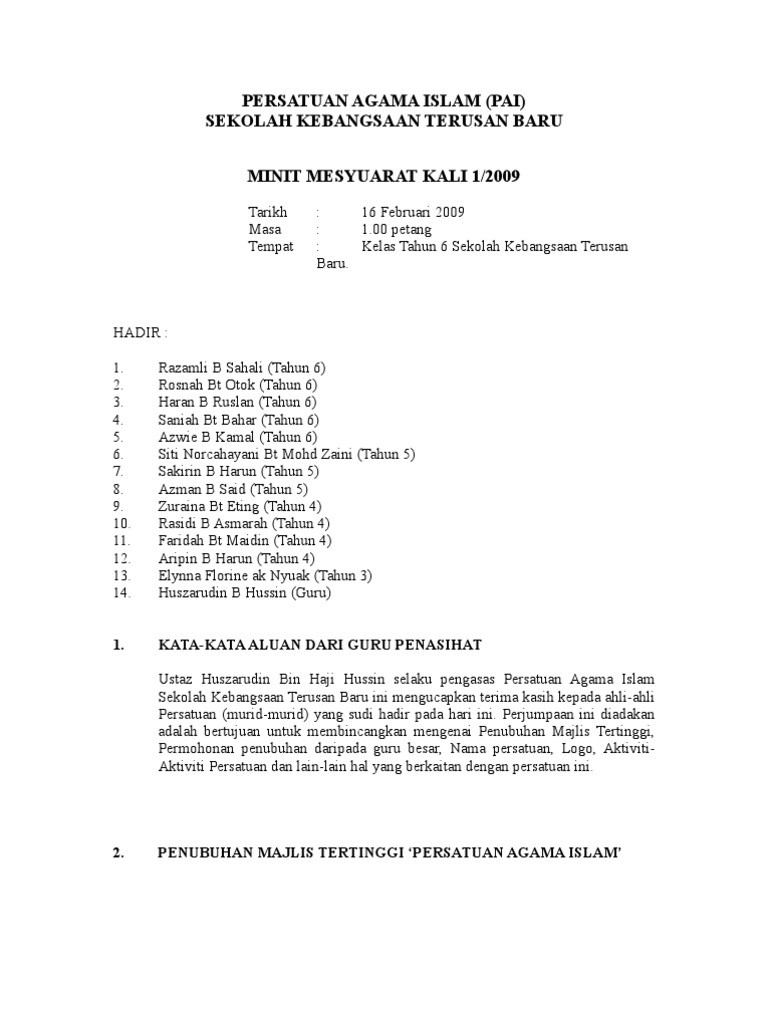 Persatuan tarikh. Tabika kemas seroja 3 kehadiran. Contoh minit mesyuarat minit mesyuarat merupakan satu laporan mengenai perkara atau hal yang dibincangkan dan diputuskan dalam sesuatu mesyuarat. Dokumen ini sangat penting kerana ia merupakan sumber rujukan masa hadapan terhadap.