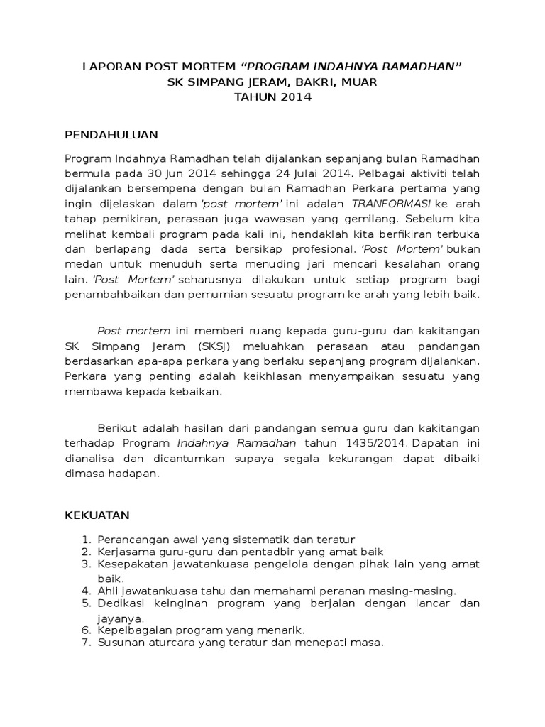 Contoh laporan post mortem program. Related posts to contoh format laporan post mortem program contoh format laporan post mortem program 2017 07 24t06 11 00 07 00 rating. 25 26 april 2015 2 3 mei 2015. Laporan post mortem program genius jalinan masyarakat. Laporan post mortem majlis persada 2008 posted by admin in berita persada laporan mesyuarat post mortem yang diadakan pada 3 syawal 1429 bersamaan 3 oktober 2008 jumaat pada jam 10 00 malam bertempat di rumah keluarga mat yusof kg.