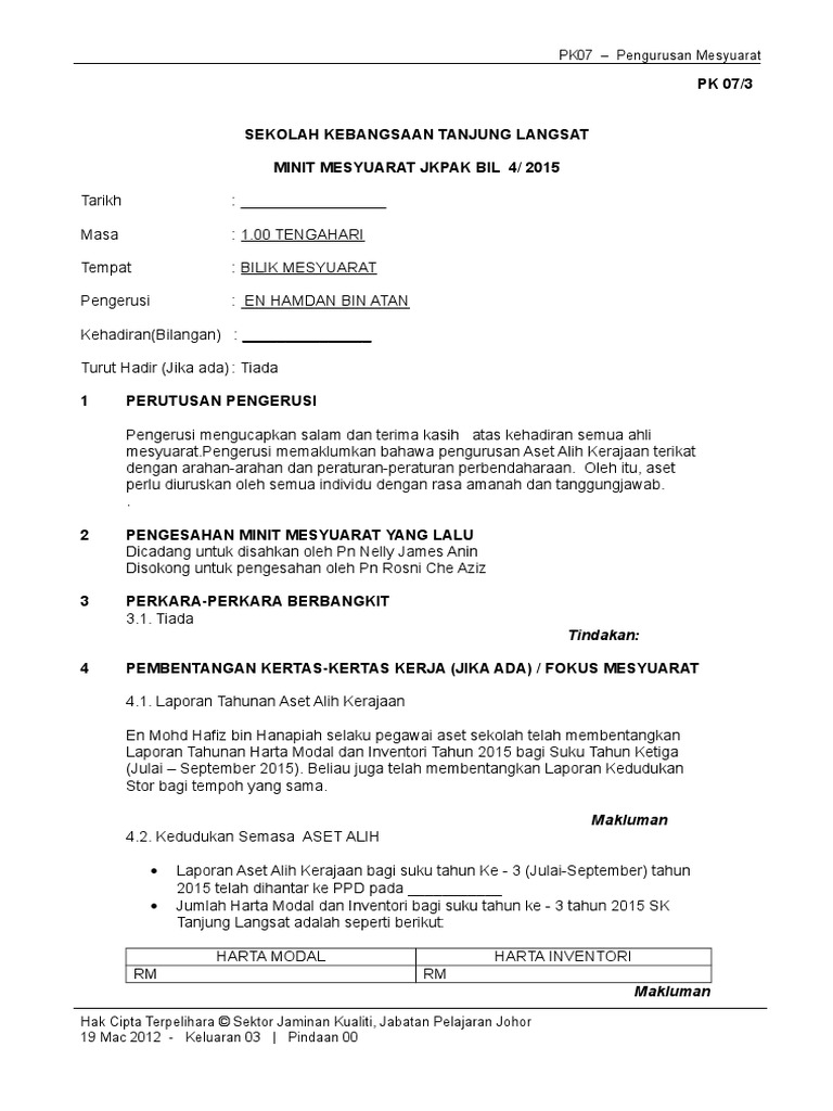 Pengisian data pinch jan feb jun okt 7. Untuk melihatkan sendiri contoh format minit mesyuarat terkini boleh semak pada pautan gambar di bawah ini contoh format terkini format tidak terlalu berbeza tidak kira anda mesyuarat anda adalah mesyuarat panatia subjek mesyuarat pibg meeting kokurikulum mesyuarat sukan mesyuarat unit bimbingan dan kaunseling ataupun untuk mesyuarat jawatankuasa kurikulum lebih kurang sama sahaja. Contoh format minit mesyuarat by mihevoli sn 17484817. Minit mesyuarat jawatankuasa aset 1 2015 1.