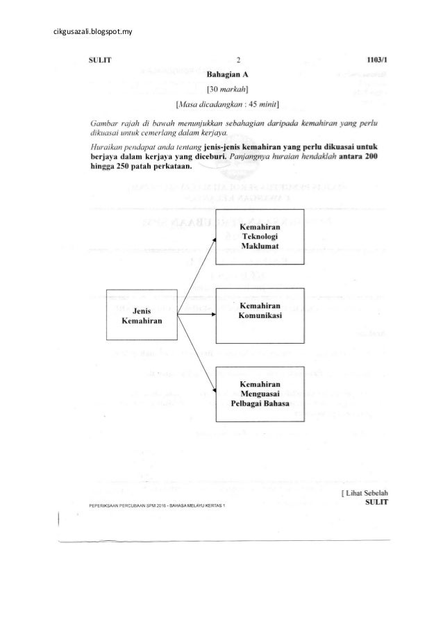 Contoh soalan bahasa melayu spm kertas 1 bahagian a. Pastikan anda download dan buat latih tubi bagi setiap soalan. Manakala bagi bahagian b anda perlu. Contoh merangka jawapan kertas 1 bahasa melayu spm soalan karangan tidak berformat papar berkaitan pada 8 5 2016 jumlah. Calon wajib menduduki semua kertas peperiksaan bagi mata pelajaran yang didaftar.