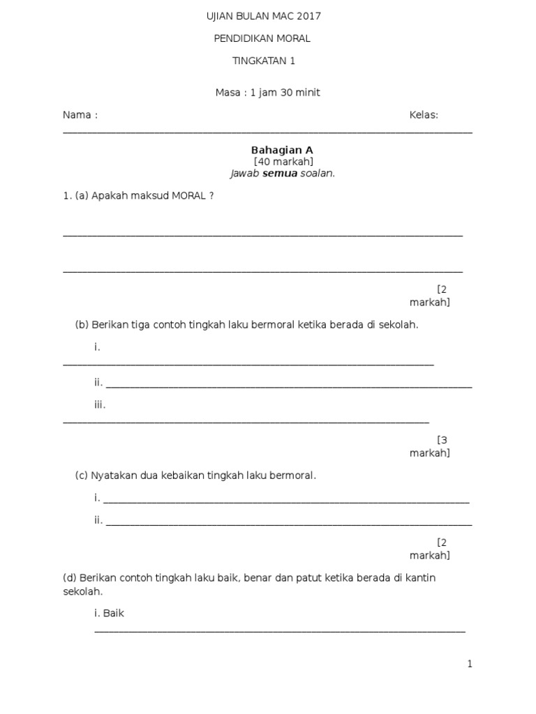 Mencipta satu masyarakat yang adil di mana kemakmuran negara. Bapa mendapat pendidikan awal hingga di peringkat sijil pelajaran malaysia sahaja. Berikan lima contoh perlakuan moral dan lima contoh perlakuan tidak bermoral yang mungkin anda dapat lihat di sana. Seseorang yang mengamalkan tingkah laku bermoral akan berasa dalam kehidupan.