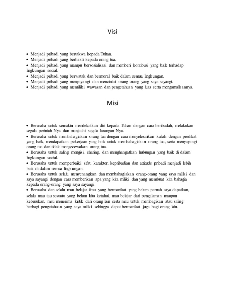 Visi merupakan sebuah tulisan singkat fokus dan jelas yang merupakan arah sebuah perusahaan instansi. Visi menjadi pribadi yang bertakwa kepada allah berakhlak mulia mendapatkan kesuksesan di dunia dan di akhirat selalu membahagiakan orang tua percaya diri dapat dipercaya dan bermanfaat bagi orang lain. Selain itu visi dibuat dalam kalimat yang singkat agar mudah diingat dan dijadikan komitmen. Contoh visi dan misi pribadi.