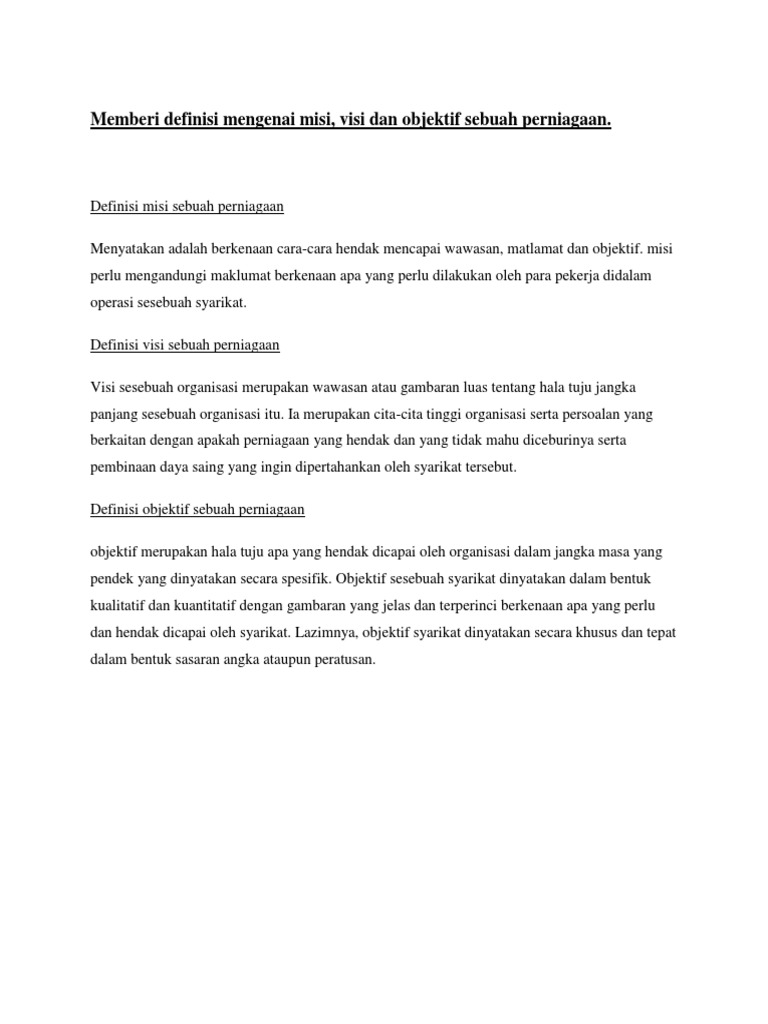 Contoh visi misi dan objektif perniagaan pakaian. Memperkenalkan busana muslimah kepada orang bukan islam. Sementara misi adalah bentuk penjabaran dari visi yang sudah dikemukakan sebelumnya. Visi misi objektif. Membuat suasana sekolah menjadi lebih nyaman dan menyenangkan 5.