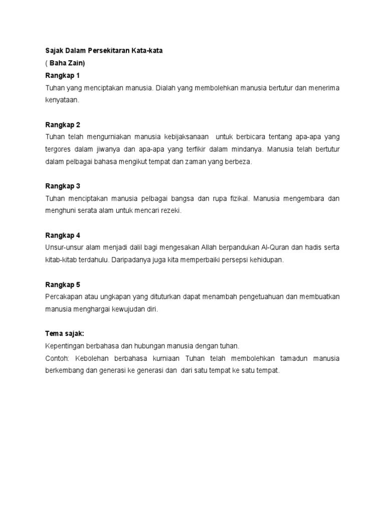 Sajak dalam persekitaran kata kata baha zain rangkap 1 tuhan yang menciptakan manusia. Dialah yang membolehkan manusia bertutur dan menerima kenyataan. Sajak dalam persekitaran kata kata k sajak roti k sajak kucari damai di sini k sajak pada sekuntum mawar k prosa tradisional pelanduk mengajar memerang k.