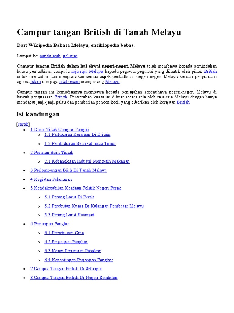 Dasar campur tangan inggeris telah bermula di perak pada tahun 1874 dengan termenterinya perjanjian pangkor diikuti oleh selangor sungai ujong dan pahang. J w w birch dilantik menjadi residen pertama di perak. Walau bagaimanapun kekacauan kekacauan berikut dijadikan alasan oleh british untuk campur tangan di perak selepas tahun 1874. Campur tangan british di tanah melayunegeri negeriselatnegeri negerimelayubersekutu persekutuan disediakanoleh.