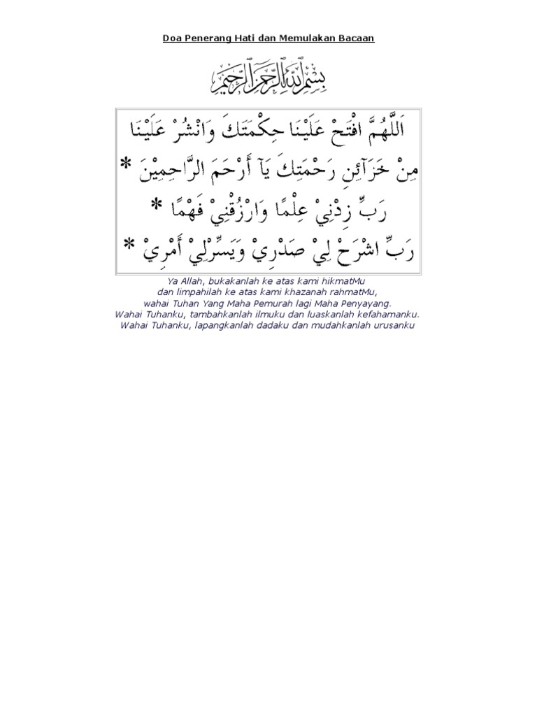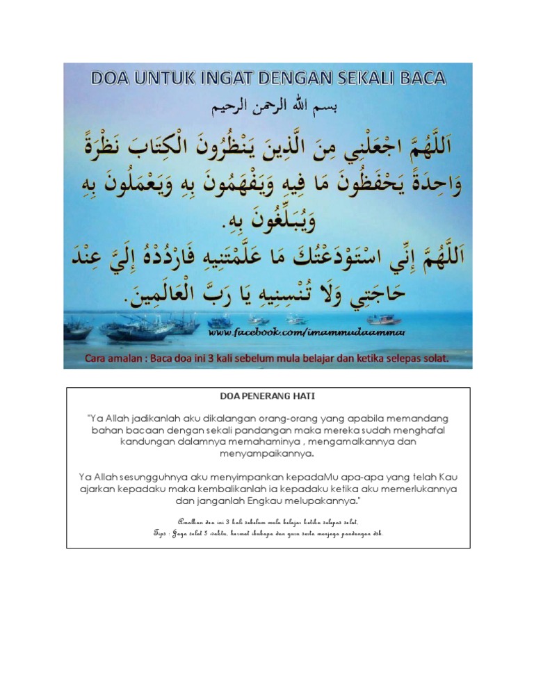 Tetapi tanpa doa dan restu si ibu. Doa penerang hati untuk mudah belajar dan menghafal assalamualaikum dan salam sejahtera buat anda semua yang sudi datang ke blog saya di sini saya ingin berkongsi dengan anda satu informasi berkaitan dengan doa penerang hati untuk memudahkan belajar serta untuk menghafal entri kali ini saya tulis khas untuk mereka yang masih lagi belajar di sekolah rendah sekolah menengah univerisiti dan. Doa dan wirid untuk pelajar dengan nama allah yang maha pemurah lagi maha mengasihani surah al fatihah doa pembuka kepada seg. Kepada sayyidina ali k w.