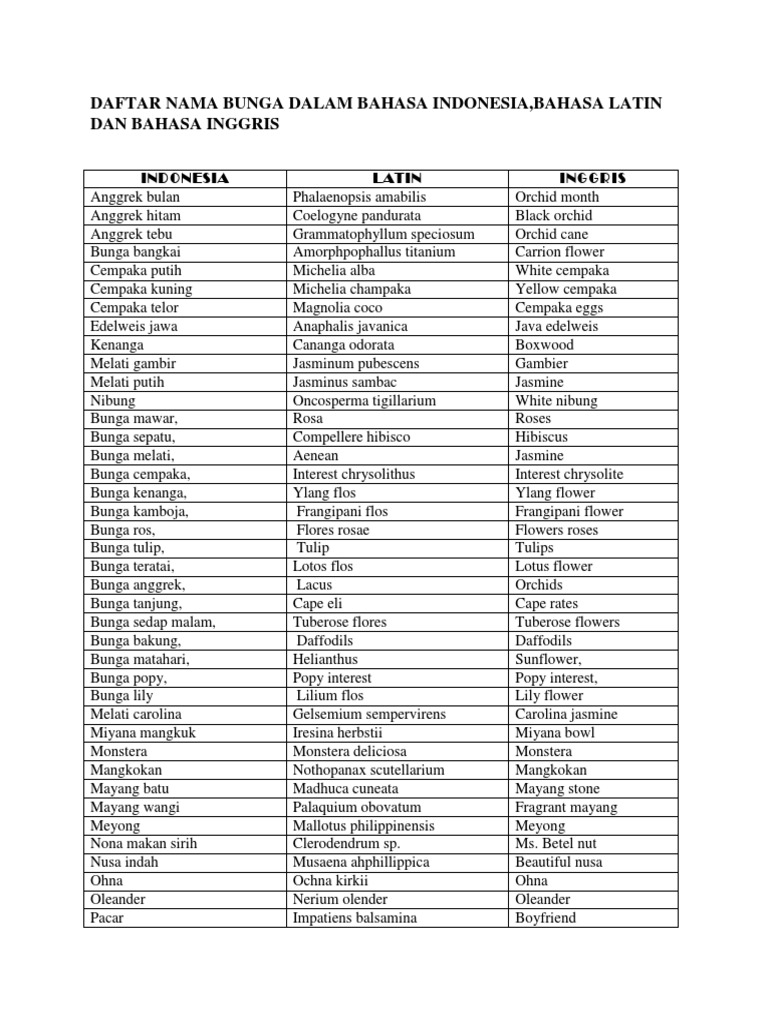 Bunga memiliki organ reproduksi yaitu benang sari dan putik. Semoga daftar berikut dapat bermanfaat untuk teman teman pecinta bunga atau yang sedang ingin menambah perbendaharaan kata dalam bahasa inggris khususnya tentang. Semoga sahabat bdbi semua menjadi lebih semangat lagi mempelajari bahasa inggris sehingga nanti pada akhirnya mampu berkomunikasi dalam bahasa inggris. Berikut ini saya punya banyak contoh nama bunga beserta artinya.