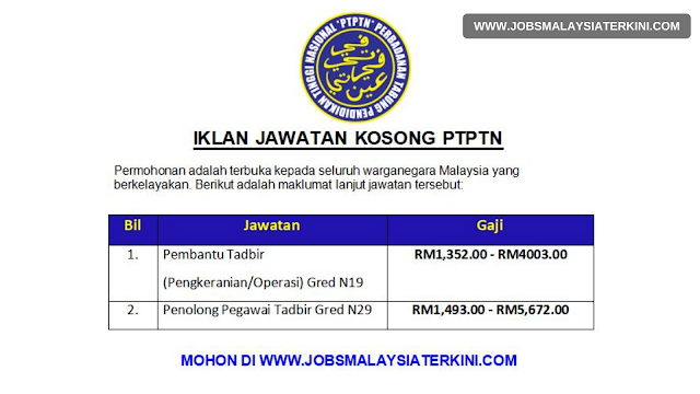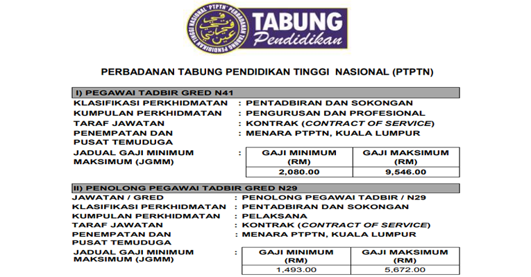 Ii penolong pegawai tadbir gred n29 menara ptptn kuala lumpur pejabat ptptn negeri ppn sarawak iii pembantu tadbir p o gred n19 menara ptptn kuala lumpur iv pembantu setiausaha pejabat gred n19 pejabat ptptn negeri ppn selangor v pemandu kenderaan gred h11 menara ptptn kuala lumpur i pegawai tadbir gred n41 tetap kontrak. Penolong pegawai tadbir gred n29 kontrak gaji tidak termasuk alaun. Ii penolong pegawai tadbir gred n29 klasifikasi perkhidmatan. Gaji dengan pelbagai imbuhan menarik.