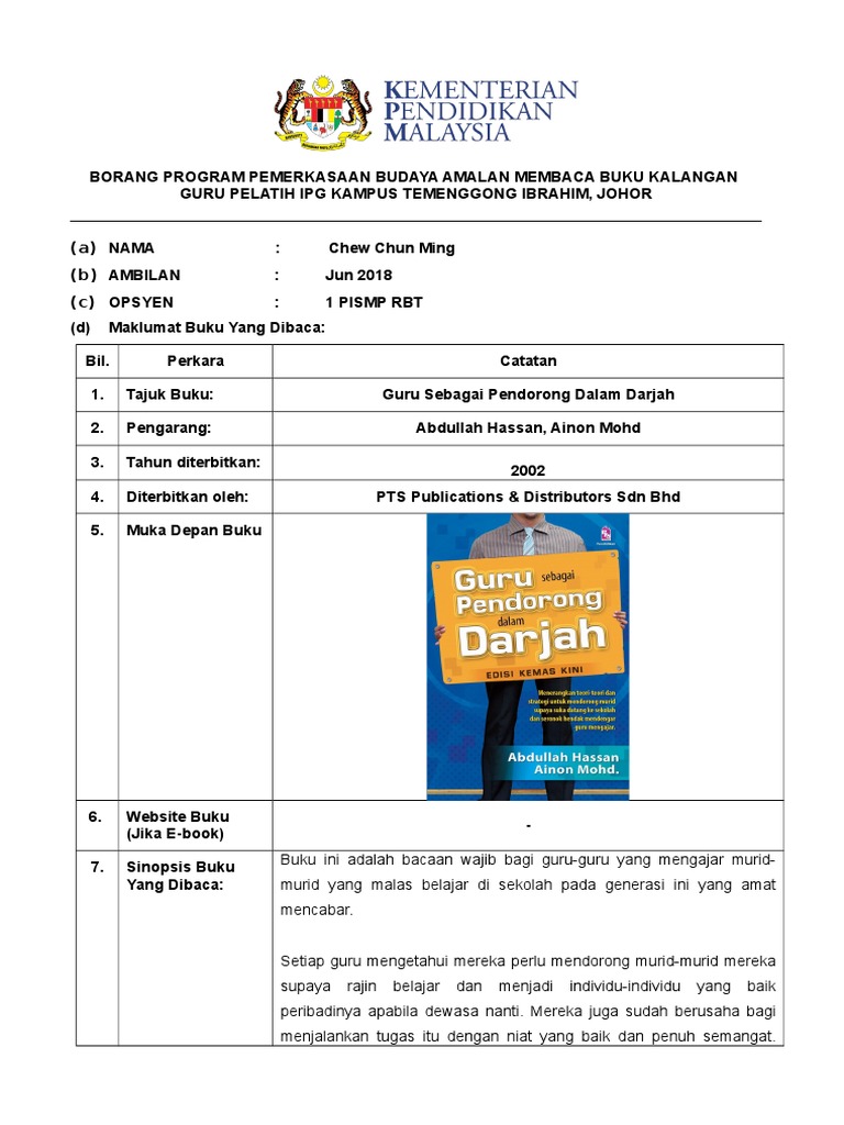 Jun 2018 c opsyen. Peranan konsep diri dalam kejayaan akademik 15. Buku terbitan pts publications distributors sdn bhd. Borang program pemerkasaan budaya amalan membaca buku kalangan guru pelatih ipg kampus temenggong ibrahim johor a nama.