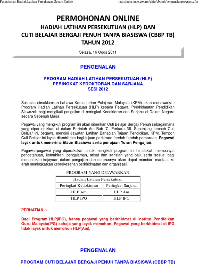 P ermohonan hadiah latihan persekutuan cuti belajar bergaji penuh dengan biasiswa cbbp db ditawarkan oleh kementerian pendidikan malaysia kpm kepada pegawai perkhidmatan pendidikan ppp untuk mengikuti pengajian di peringkat pascasiswazah ijazah sarjana dan kedoktoran bertujuan untuk membangunkan warga pendidik yang kompeten bagi memenuhi keperluan strategik pendidikan negara demi. April 11 2018 april 23 2018 suhaizadsan travelaw. Tips memohon dan temuduga biasiswa hadiah latihan persekutuan hlp dan cuti bergaji penuh jpa. Tawaran hadiah latihan persekutuan bagi pegawai perkhidmatan pendidikan ppp tahun 2020.